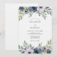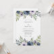 This design features a watercolor-inspired arrangement of deep slate blue blossoms and soft lavender blooms, accented by delicate greenery. The composition evokes a romantic and artistic mood, perfect for an elegant affair.