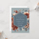 An elegant and romantic design featuring a painterly arrangement of beautiful blooms. Lush, full-petaled roses in shades of terracotta and rust create a warm contrast against a sophisticated slate blue backdrop. Muted greenery and delicate buds complete this artistic and moody botanical composition for your nuptials.