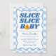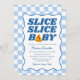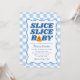 Serve up a slice of fun with these playful “Slice, Slice, Baby” pizza-themed baby shower invitations, designed to celebrate a baby boy. The design features the phrase “Slice Slice Baby” in bold dark blue lettering with a soft light blue shadow, paired with a cute slice of pizza with pepperoni hearts forming the letter “A.” A dark blue wavy border frames the invitation, set against a light blue and white checkerboard background for a cheerful Italian-inspired style. Personalize the invitation with the mom-to-be’s name and baby shower details to create a fun and memorable baby shower invite that’s perfect for pizza-themed celebrations welcoming a baby boy.