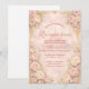 This elegant quinceañera design features a soft blush watercolor background framed by romantic roses, delicate florals, and refined gold ornamental accents, creating a luxurious yet gentle garden aesthetic. The airy center keeps the layout light and readable, while the pastel palette and layered florals give the design a timeless, feminine, and slightly fairytale feel—perfect for a classic, refined quinceañera celebration with an elevated, graceful atmosphere.