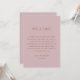 This double sided wedding card in soft mauve pink is designed for couples who appreciate subtle color, thoughtful organization, and refined simplicity. The muted background feels calm and balanced, offering a modern alternative to traditional blush tones while still keeping a soft, romantic mood. One side of the card features a wedding day timeline, presenting the sequence of events in a clear and easy to follow format. It works as a gentle schedule for your guests, helping them understand the flow of the day without drawing attention away from the celebration itself. Everything feels intentional, quiet, and well paced. The reverse side acts as a welcome card, completing the piece as a full wedding itinerary rather than a single use schedule. This color is especially suited for modern romantic weddings, minimal elegant celebrations, and indoor or evening events, as well as spring and early fall weddings. Available as both a printed card and a digital download.