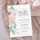 Fêtez l'arrivée prochaine d'une petite fille douce avec cette magnifique invitation au baby shower féminin. Avec son joli charme boho, cet élégant design floral aquarelle a des roses pastel rose pastel et pêche et des pavots avec une belle végétation d'eucalyptus traînant le long de la bordure gauche. Une police d'affichage élégante épelle "Baby shower" dans un style de livre d'histoires magnifique. Personnalisez le modèle de texte avec vos détails. Cette invitation est disponible en téléchargement numérique imprimé et sans papier.
