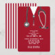 Invitations créatifs de fin d'études en sciences infirmières avec gommages rouges et stéthoscope.