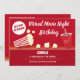 Une invitation de fête d'anniversaire de soirée cinéma virtuelle pour les enfants (ou les enfants dans l'âme) avec des personnages de dessin animé de popcorn et de boisson souriants. L'invitation a un schéma de couleur rouge et blanc qui comprend un fond rouge. Il y a de la place au dos de l'invitation pour expliquer comment vos invités peuvent rejoindre la fête virtuelle. Tous les mots peuvent être personnalisés.