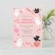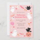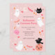 Invités Invitations à votre soirée costumée halloween avec cette invitation mignonne. Le design est composé de citrouille, de chats noirs, de mignons fantômes et de scintillants scintillants, et d'autres signes de la saison dans des tons roses sympathiques. Personnalisez avec vos propres noms et détails de fête!