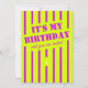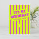 Une superbe carte minimaliste d'invitation à l'anniversaire jaune vert ornée de rayures lilas néon et d'une bougie. Toutes les phrases de texte peuvent être customisées.
