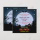 Cartes d'invitation à une soirée de costume d'Halloween effrayante avec une scène de nuit d'Halloween effrayante avec de vieux arbres, des citrouilles, des tombes et des chauves-souris pour un festin d'horreur. Des modèles pour ajouter les détails de votre soirée d'Halloween sont sur le recto et le verso de l'invitation.