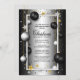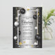 Célébrez la saison festive et invitation vos collègues de travail et invités spéciaux cette année avec cette invitation de fête de Noël moderne qui comprend une bordure blanche ornée de baubins d'arbre de Noël noir et blanc sur un arrière - plan noir et argent.