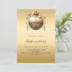 Une invitation à une fête de Noël. Un arrière - plan à l'allure d'or. Décoré d'un grand bauble doré à l'aspect vintage. Personnalisez et ajoutez les détails. Texte noir.