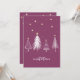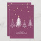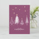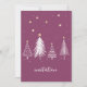 Dîner de Noël Purple Elegant Party Invitation Card conçu avec des arbres de Noël blancs et des étoiles de couleur or sur un arrière - plan mauve doux. Le texte avant comprend : invitation. Le texte inverse comprend : votre date, heure, emplacement, noms d'hôtes et détails RSVP. Pour personnaliser, il vous suffit de remplacer l'exemple de texte en utilisant notre modèle facile. Assurez-vous de voir les accessoires Elegant Christmas Party Purple correspondants.