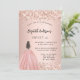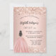 Une invitation moderne, élégante et glamour pour une fête Sweet 16, 16e anniversaire. Un arrière - plan rose en or avec de la poussière de parties scintillant en faux or, une fille portant une robe de bal. Le nom est écrit avec un script de style moderne écrit à la main. Personnalisez et ajoutez les détails de votre fête.