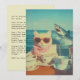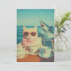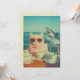 Un chat cool portant des lunettes de soleil roses et une écharpe prend le thé à une table en bord de mer tandis qu'un requin dramatique saute de l'océan en arrière - plan.