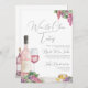 Invitation élégante à l'aquarelle pour une dégustation de vin et de fromage. Un thème adorable de dégustation de vin et de fromage ou de soirée de dégustation de vin rose et violet, parfait pour une pendaison de crémaillère, un anniversaire, une fête de fiançailles de couple, une soirée entre filles, ou simplement pour l'amour du vin ! Complet avec des bouteilles de vin rose à l'aquarelle, et des verres de vin, un petit fromage jaune, et puis des raisins adorables en rose et violet et bien sûr des feuilles de vigne vertes.
