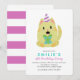Les invitations adorables à une fête d'anniversaire sont illustrées d'un chaton jaune tenant un cadeau et portant un casquette de fête.