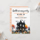 Invitez vos invités à une soirée costumée d'Halloween avec cette invitation ludique et effrayante. Le design présente un fond noir et blanc avec un mélange de typographie script, de polices grasses et simples en orange et noir saisissants pour un contraste audacieux. En bas, une maison hantée noire est rehaussée de citrouilles orange vif, de jack-o-lanterns et d'arbres inquiétants. De petits fantômes et chauves-souris mignons flottent autour, ajoutant une touche fantaisiste au design. Les polices ont un aspect légèrement dégradé, dégageant une atmosphère vintage et effrayante. Le verso présente un motif rayé orange et blanc, que vous pouvez personnaliser en changeant la couleur de fond ou des rayures pour l'adapter à votre thème. Parfait pour créer l'ambiance d'une soirée d'Halloween amusante et hantée ! Invitation de soirée d'Halloween Maison hantée effrayante Écriture élégante Citrouilles Fantômes