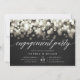 Nos élégantes invitations de fiançailles en noir, or et blanc chic sont dotées d'une bordure supérieure de lumières de bokeh huées au champagne, avec "fiançailles" en typographie de script de calligraphie chic. Personnalisez avec vos détails de célébration fiançailles en dessous en blanc. Un design chic en noir et blanc classique pour les couples modernes et les événements élégants.