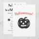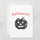 Invitation de fête d'Halloween mignonne et effrayante avec des graphiques noirs sur fond blanc. Le devant comporte une citrouille noire et le mot "Halloweeeen" écrit avec des fautes volontaires dans une police orange effrayante ! Le texte au verso est "Vous êtes invités à une fête d'Halloween !" dans une police effrayante. Vous pouvez personnaliser le reste du texte : "N'oubliez pas de porter un déguisement", date, heure, lieu, RSVP/numéro de téléphone. Deux versions plus petites de la citrouille sont également imprimées au verso.
