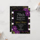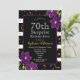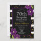 70e fête d'anniversaire surprise | Dessin pailleté noir et or avec détail floral violet . Il s'agit d'un modèle prêt à être personnalisé avec les détails de votre fête .