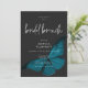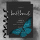 Ce design d'invitation wedding shower présente un thème sombre, moody qui est simple, mais étonnant. Un arrière - plan noir au charbon de bois foncé est la toile parfaite pour un seul papillon bleu turquoise, ses ailes étalées pour le vol. Unique et élégant, ce design peut être utilisé pour n'importe quelle saison. Créé par Simply Farmhouse Press.