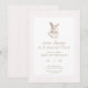 A timeless vintage bunny illustration with soft neutral color palette and delicate pink ribbon detail. Designed for a sweet first birthday celebration with a classic stripe background and elegant typography. Great for invitations, party decor, and keepsake prints.