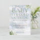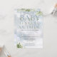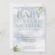 Une élégante invitation au baby shower d'hiver avec une élégante typographie bleu poussiéreux et de jolies feuilles de verdure botanique sur un arrière - plan de flocons de neige d'hiver. Conçu par Thisisnotme©