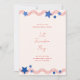 Célébrez l'anniversaire de l'Amérique avec cette invitation de fête de barbecue de jardin le 4 juillet amusante et patriotique avec des bandes rouges festives et des étoiles bleues sur un fond de couleur ivoire.