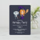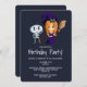 Une invitation à la fête d'anniversaire avec une mignonne sorcière portant un grand casquette de sorcières violettes. Son chat noir posé sur sa tête, adorable ! Elle a de longs cheveux orange et porte un balai. Un squelette blanc à l'air amical à côté d'elle. Belle illustration de dessin animé parfaite pour l'halloween.