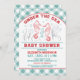 Invitation mignonne de baby shower avec deux hippocampes et bébé. Teal/arrière - plan de motif guingan d'aqua, palourdes, bulles, corde du pêcheur et algue. Facile à customiser avec votre propre texte. Grand pour une plage, un océan, une mer, un pique-nique, une partie nautique ou d'été du bébé q/baby shower de couples. Illustration originale par le pj_design. Veuillez examiner mon magasin pour assurer plutôt ceci.