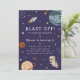 Cute space themed kids birthday invitation featuring playful astronaut, planet and star illustrations paired with fun, stylish typography on different color backgrounds. You can find more matching items from this collection in our store.