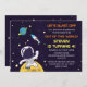 Invitation à la fête d'anniversaire avec un arrière - plan bleu foncé aux étoiles jaunes éparpillé autour. Couché sur le dessus est l'illustration d'un astronaute vêtu d'une combinaison blanche flottant au-dessus de la lune. Au loin se trouve une planète avec des anneaux et un vaisseau-fusée qui s'envole dans le ciel à la recherche de nouveaux mondes à explorer