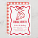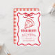 This cute "special delivery" kid's birthday invitation features hand-drawn illustrations of a bow and slice of pizza surrounded by a red wavy frame. The reverse side features a white background with a red gingham plaid. Personalize it for your needs. You can find matching products at my store.