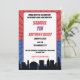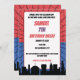 Cette invitation d'anniversaire présente une silhouette d'une ville, et des toiles d'araignée sur un arrière - plan bleu et rouge. Cette invitation de super-héros rouge et bleu d'anniversaire est prêt à être personnalisée et convient pour une fête d'anniversaire de super-héros d'araignée.