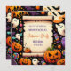 Le design comporte un défilement de parchemin vieilli au centre, offrant un espace vide pour le texte. Autour du parchemin se trouvent diverses icônes sur le thème de l'Halloween, dont des lanternes crêpes souriantes, des fantômes à différentes expressions, du maïs-bonbons, des lollipops de couleur Halloween, des araignées noires et des chauves-souris. L'arrière - plan est un violet profond avec des motifs étoiles subtils, créant une atmosphère ludique et éffrayante parfaite pour une invitation à Halloween.