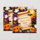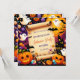 Le design comporte un défilement de parchemin vieilli au centre, offrant un espace vide pour le texte. Autour du parchemin se trouvent diverses icônes sur le thème de l'Halloween, dont des lanternes crêpes souriantes, des fantômes à différentes expressions, du maïs-bonbons, des lollipops de couleur Halloween, des araignées noires et des chauves-souris. L'arrière - plan est un violet profond avec des motifs étoiles subtils, créant une atmosphère ludique et éffrayante parfaite pour une invitation à Halloween.