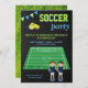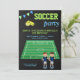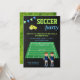 Invitation vos invités avec cette invitation de fête d'anniversaire cool mettant en vedette des garçons mignons sur un terrain de football contre un arrière - plan de tableau noir. Ajoutez simplement les détails de votre événement sur ce modèle facile à utiliser pour en faire une invitation unique. Retournez la carte pour révéler une belle texture d'herbe verte au dos de la carte.