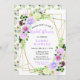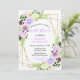 This fun and whimsical bridal shower invitation features watercolor purple flowers and foliage on a gold geometric frame. The text combines handwritten script and serif fonts for a stylish and modern look. This is perfect for a spring or summer rustic bridal shower.