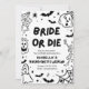 Bride ou Die 💋 💀 🖤 C’est son dernier vol... alors faisons-le fabuleux ! Cette invitation à la fête bachelorette d'Halloween en noir et blanc gothique présente des squelettes dessinés à la main pointus, des détails éffrayants et des illustrations obstinément mignonnes — chauves-souris, toiles de cobaye, fantômes, et plus 🕸️ 🦇. Parfait pour un week-end de sorcière, un voyage déplaisant-chic de filles, ou "Till Death Do Us Party" vibe 🎃 Editable, audacieux et totalement iconique pour votre mariée éffrayante préférée. ⚡ Doit-avoir pour toute équipe de ghoul prête à tuer la nuit ! ⚡