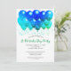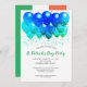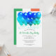St. Patrick's Day célébration vert et bleu neon invitation ballons de fête avec des shamrocks verts et bleus et un drapeau irlandais à l'arrière de l'invitation.