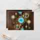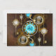 Turquoise lenses with antique watch with brass gears and golden keys on rusty, brown background. Steampunk style.