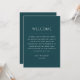 This refined double sided wedding timeline card in stormy teal offers a bold yet elegant way to guide guests through your wedding day. The color - also known as deep teal blue - features a rich, moody depth that feels dramatic, modern, and effortlessly sophisticated. One side of the card presents a wedding day timeline, thoughtfully arranged to showcase the flow of events from ceremony through reception. It helps guests feel relaxed and informed while maintaining a clean, elevated look. The reverse side functions as a welcome card, greeting guests with warmth and intention. This color is especially suited for evening weddings, modern elegant celebrations, fall or winter weddings, and venues with a romantic or dramatic atmosphere. More than just informative, this minimalist card becomes part of the overall visual experience - something guests notice, appreciate, and remember. Available as both a printed card and a digital download.