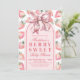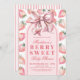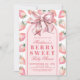 A cute and girly “Berry Sweet” baby shower theme featuring watercolor pink strawberries with green leaves. A blush pink arch sits at the center, topped with a soft pink watercolor bow for a sweet coquette touch. The text is styled in dark pink fonts, mixing handwritten script with bold serif and simple typography for a playful yet polished look.