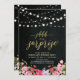 Célébrez une journée spéciale avec cette invitation à l'anniversaire d'anniversaire fleuri et rustique. Ce design présente des lettres élégantes "shhh C'est une surprise" avec des lampes à cordes et un bouquet de fleurs sur un arrière - plan de texture de tableau noir. Vous pouvez customiser le texte à n'importe quel âge ou événement (30ème, 40ème, 50ème, 60ème, 70ème anniversaire, etc). D'autres invitations assorties et fournitures de fête sont disponibles dans ma boutique BaraBomDesign.