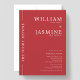 Présentant un design élégant et sophistiqué de l'invitation à dîner de répétition, parfait pour les couples à la recherche d'une touche moderne. Ce modèle est décoré d'un arrière - plan rouge audacieux qui respire l'élégance et le style. Les noms sont affichés en évidence dans une police serif blanche classique, ajoutant un charme intemporel à la conception. L'expression "La nuit avant" est élégamment positionnée le long du bord gauche, ouvrant la voie à un rassemblement intime. L'aménagement est propre et organisé, assurant ainsi que tous les détails de l'événement sont clairement présentés. Cette conception inclut des champs personnalisables pour la date, l'heure et l'emplacement de l'événement, ce qui vous permet de personnaliser facilement votre personnalisation pour votre famille et vos amis. . L'invitation offre également de l'espace pour les détails RSVP, assurant une expérience transparente pour les hôtes et les invités. cette conception d'invitation combine simplicité moderne et élégance classique, ce qui en fait un choix exceptionnel pour tout dîner de répétition.