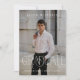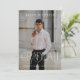 Cette invitation moderne à la fête de remise de diplômes en une photo comprend une photo complète avec une typographie stylisée sur le devant, et les détails de la fête de remise de diplômes sur un dos bleu ardoise.