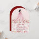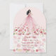 This invitation stands out for its sophisticated watercolor effect, bringing an artistic, soft, and ethereal feel to the design. The illustration features a full-body woman in a graceful model pose, with dark hair and a delicate, refined presence. She wears a pink tulle dress adorned with flowers that appear to scatter softly in shades of pink, red, and white, accompanied by green leaves that add freshness and balance. The front background is white, allowing every brushstroke to be seen clearly, while the back of the invitation is red, adding warmth and contrast that elegantly complements the illustration without interfering with its artistic details. Every element conveys charm, femininity, and a romantic aura, making this invitation both exquisite and visually captivating.