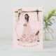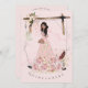 Chérie comme une poupée princesse avec rose rose, pétillant, robe formelle Quinceañera, bordée de roses géants. La beauté aux longs cheveux noirs est encadrée et entourée d'une arche Boho avec plumes, cristal et lumière pour sa soirée spéciale.