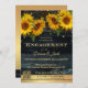 Une invitation festive de fête design avec des tournesols et des étincelles légères sur un bois rustique et un arrière - plan métal vert foncé avec doublure dorée. Beau pour une fête d'automne ou d'automne. Le texte "Fiançailles" est une image stylisée et vous pouvez la supprimer si vous le souhaitez. Vous pouvez également remplacer le dos par votre photo personnalisée si vous le souhaitez.