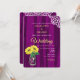 Des invitations rustiques et élégantes dans un effet de grain de bois violet avec un joli vase en pot de maçon plein de fleurs jaunes de soleil et un joli motif en dentelle blanche sur les bords. Idéal grange mariages et Thanksgiving mariages de temps d'automne.