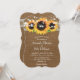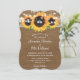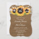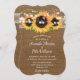Faire-part de mariage de tournesol rustique avec tournesol contre un burlap et arrière - plan en dentelle orné de lampes à cordes.