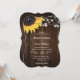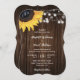 Faire-part de mariage de tournesol rustique avec des tournesols contre un arrière - plan en bois de grange orné de lampes à cordes. Un design de carte parfait pour inviter vos invités à votre mariage rustique, jardin ou grange inspiré des tournesols.